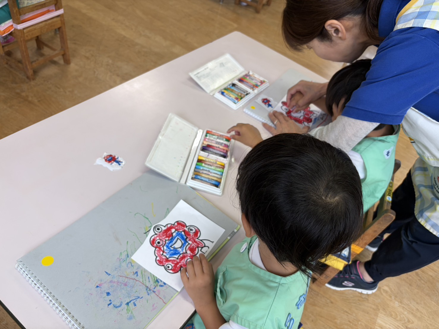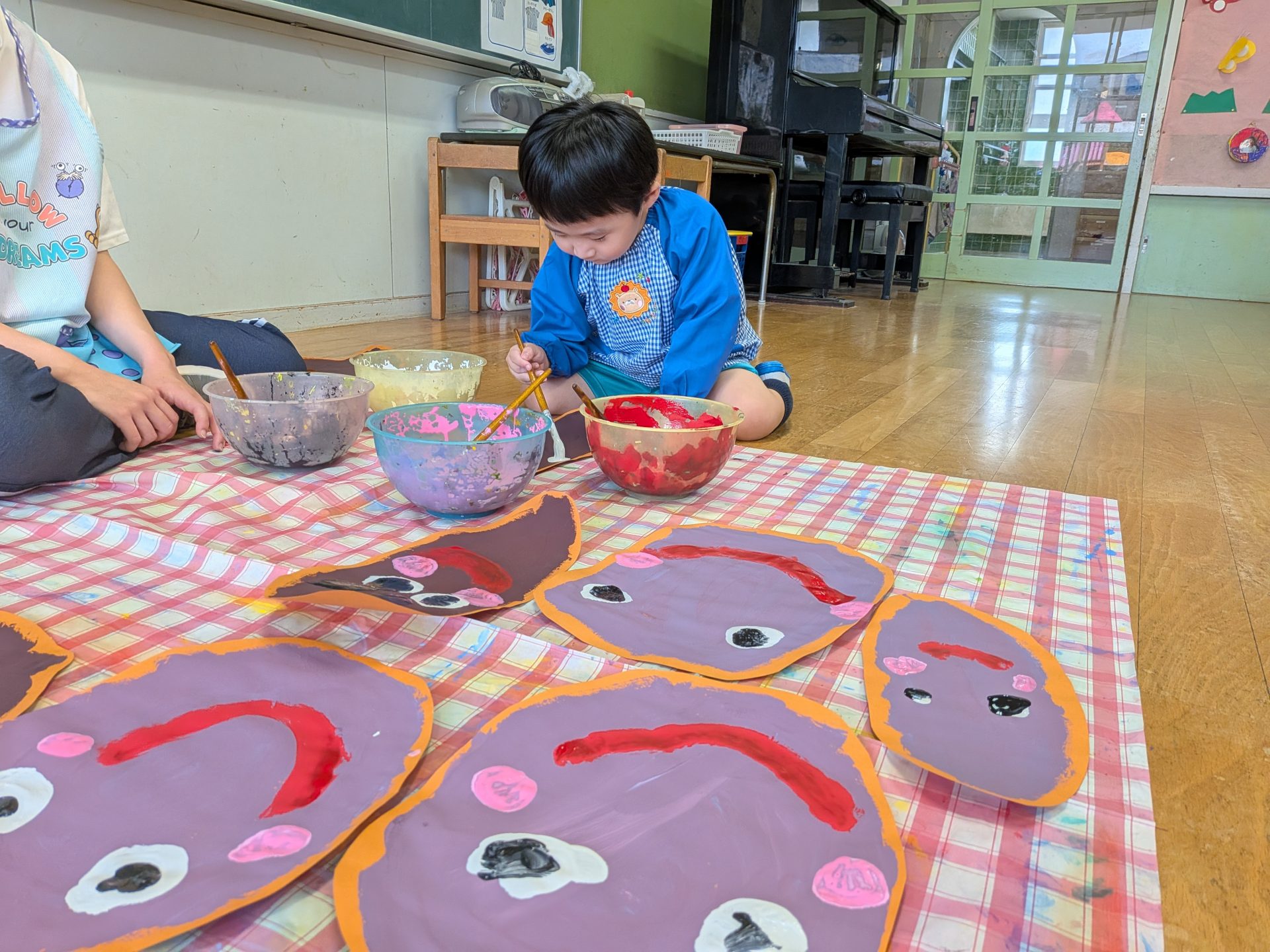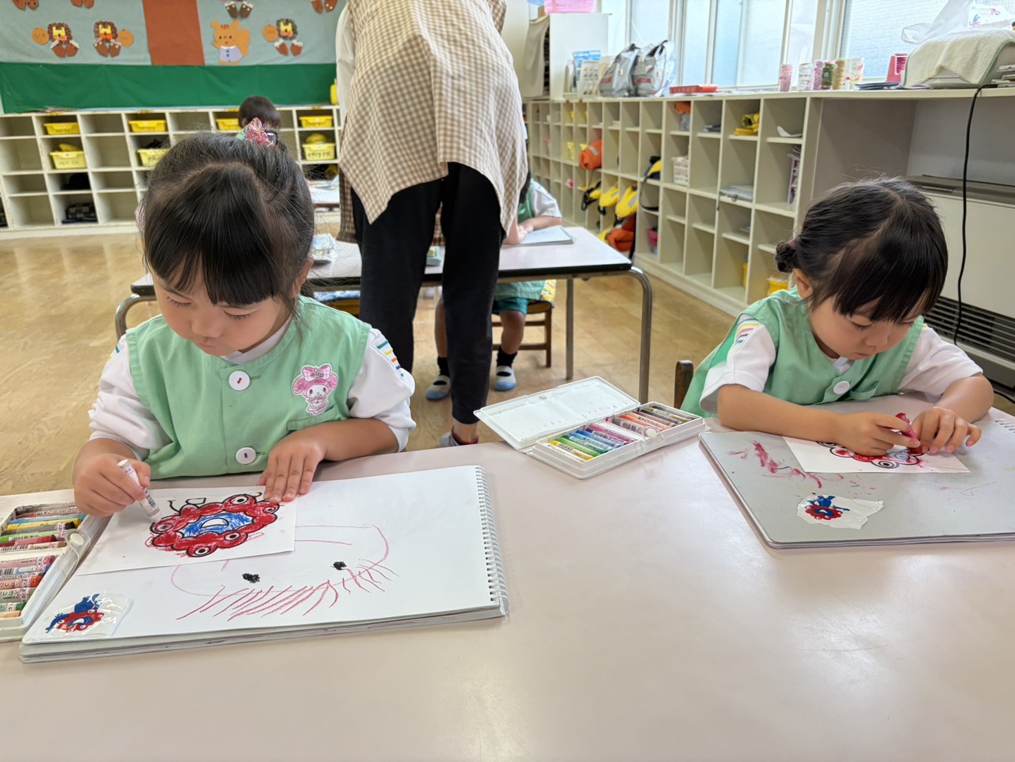 今日は年少さんは七五三の飴袋づくり、今年はミャクミャクの飴袋 一生懸命色塗りと着物の貼り付けをしていました