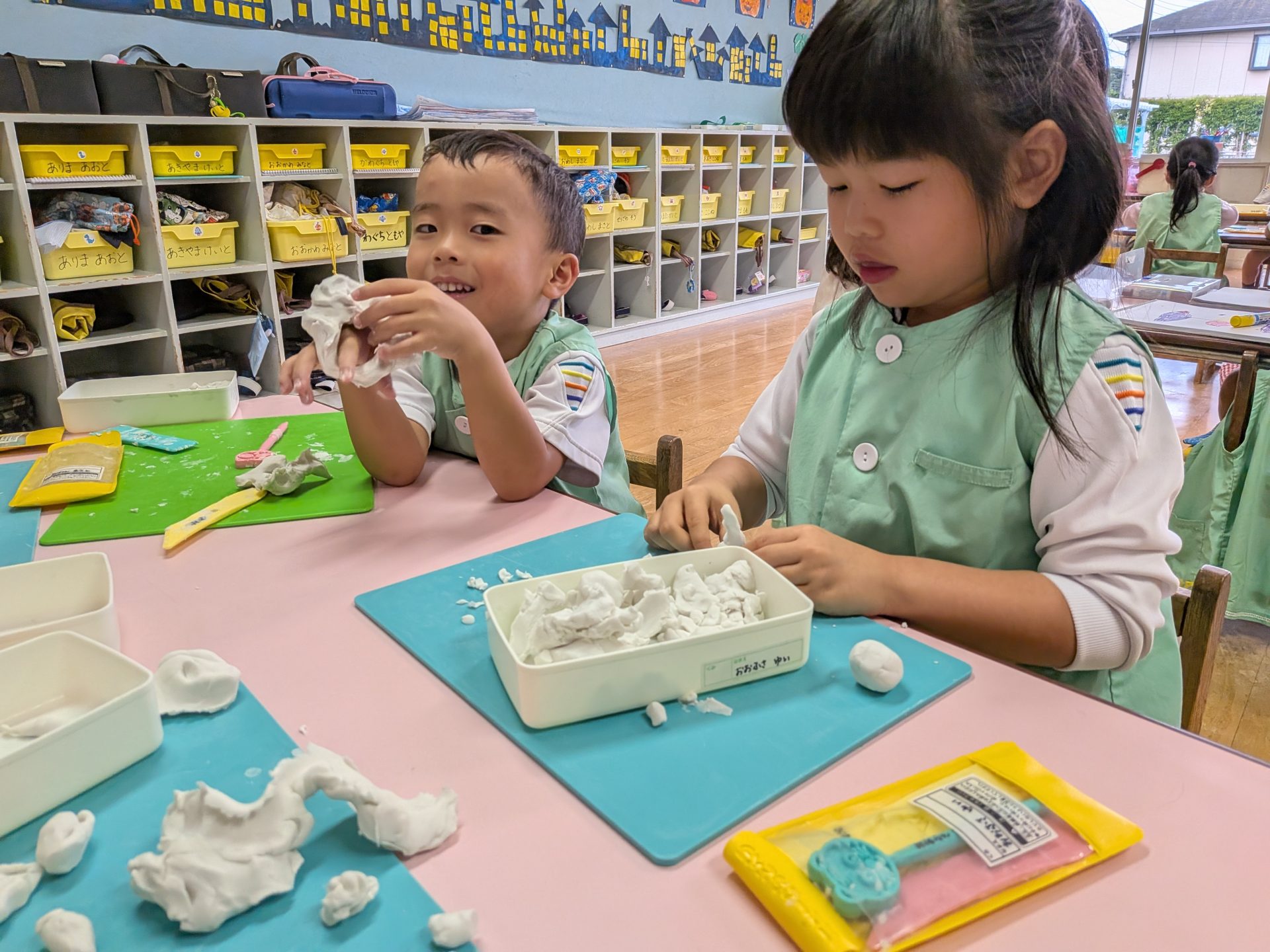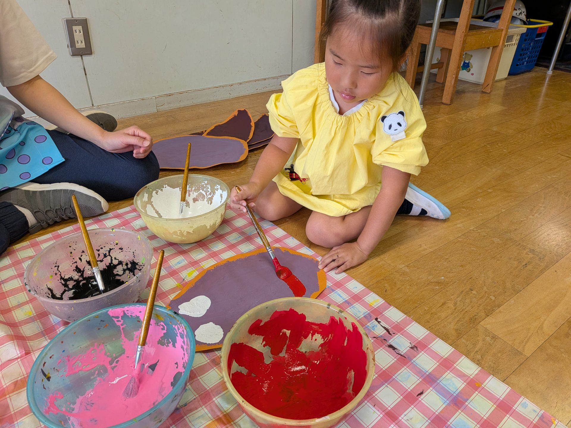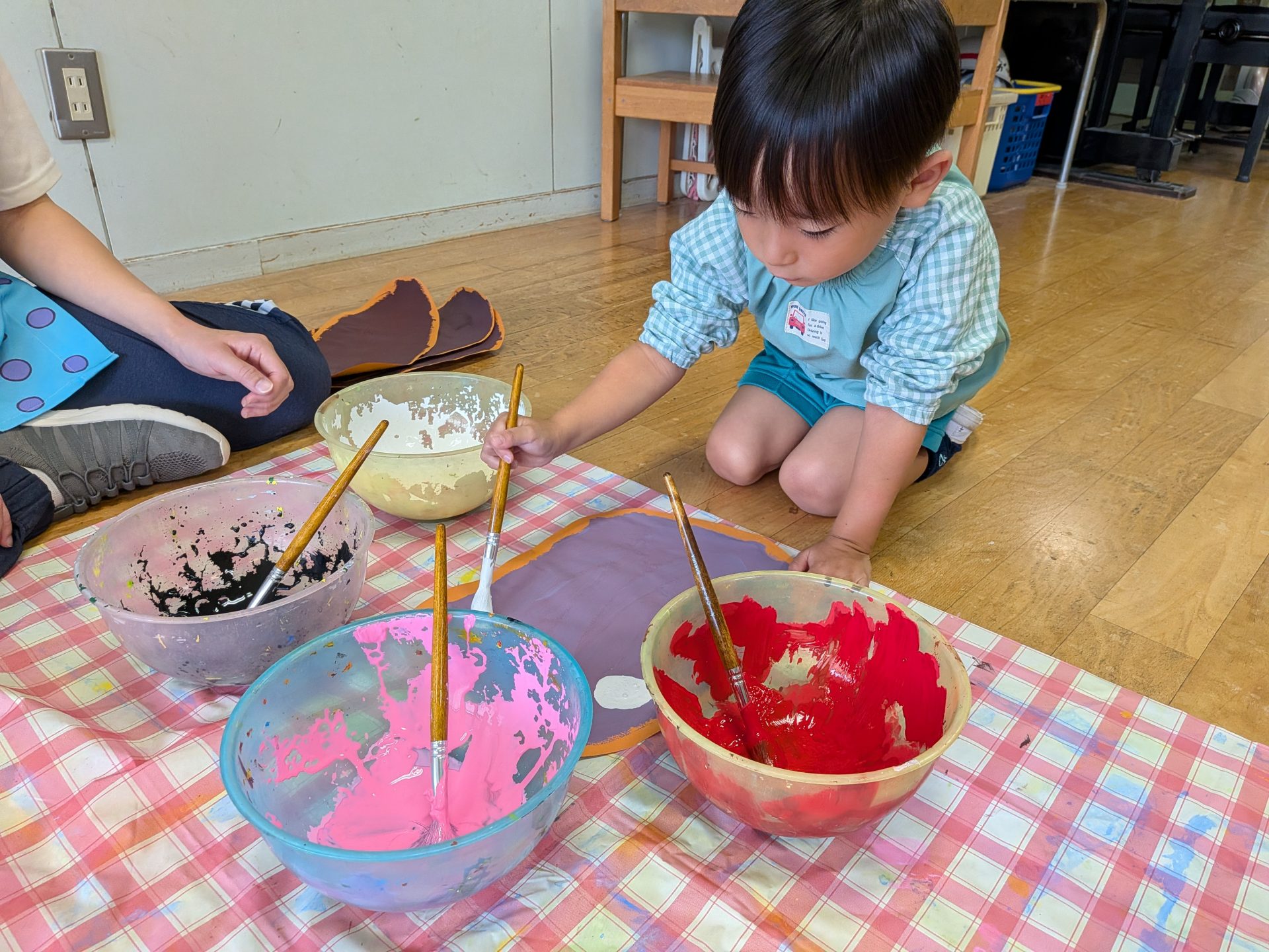今日は年少さんは七五三の飴袋づくり、今年はミャクミャクの飴袋 一生懸命色塗りと着物の貼り付けをしていました