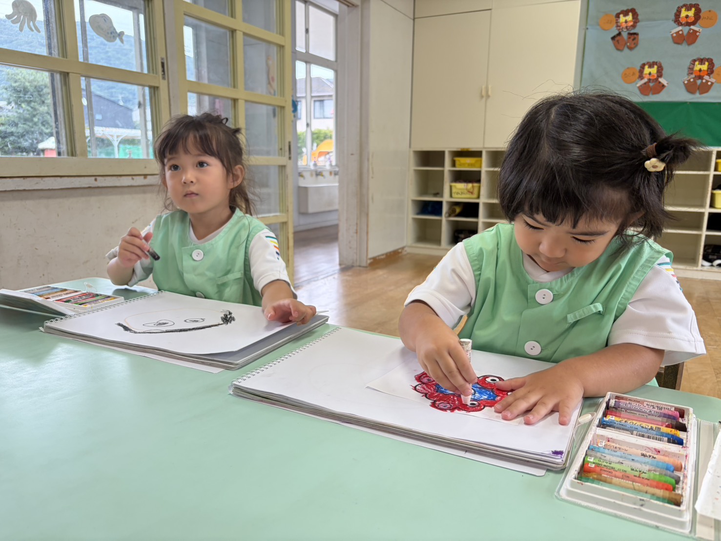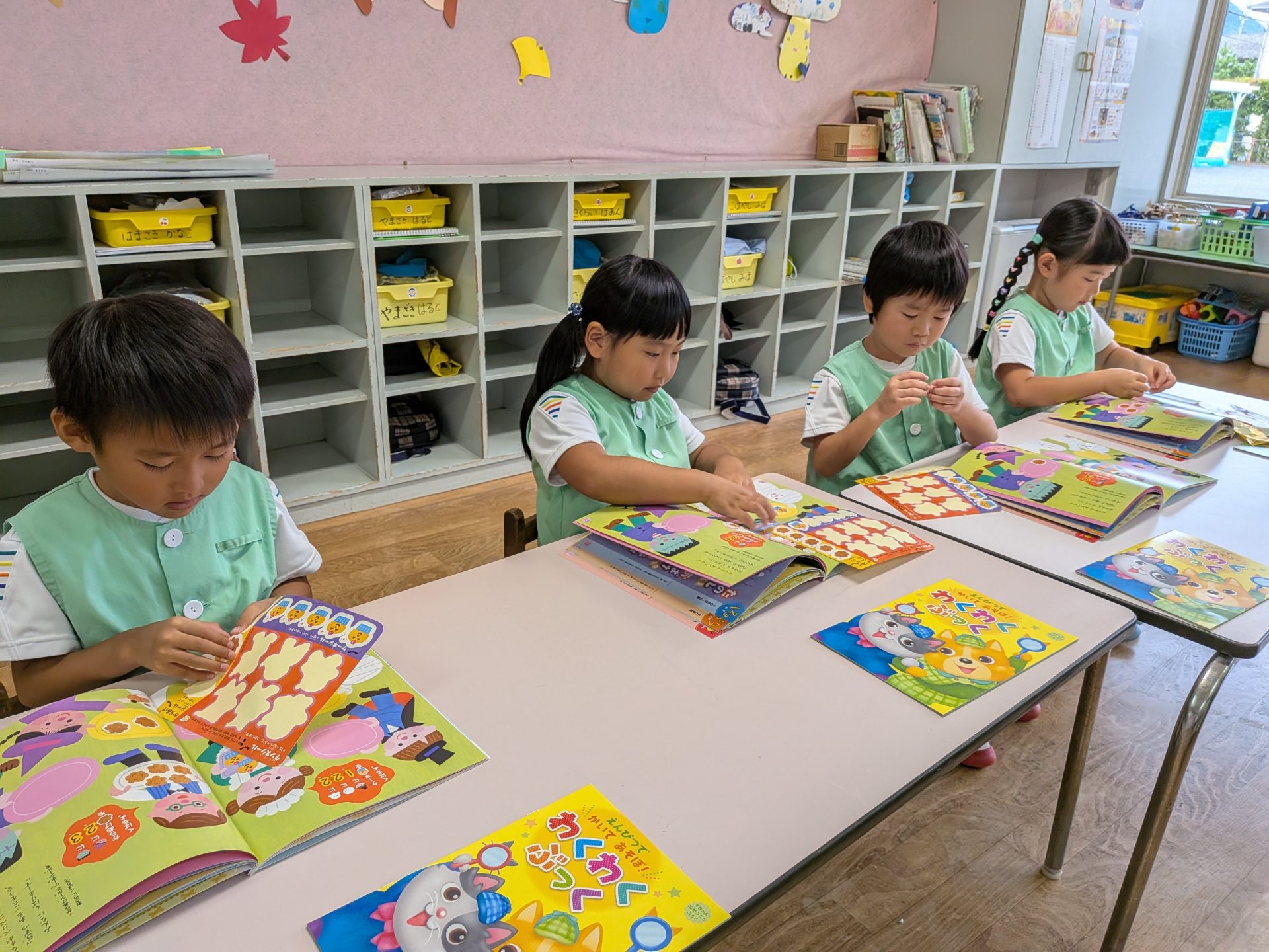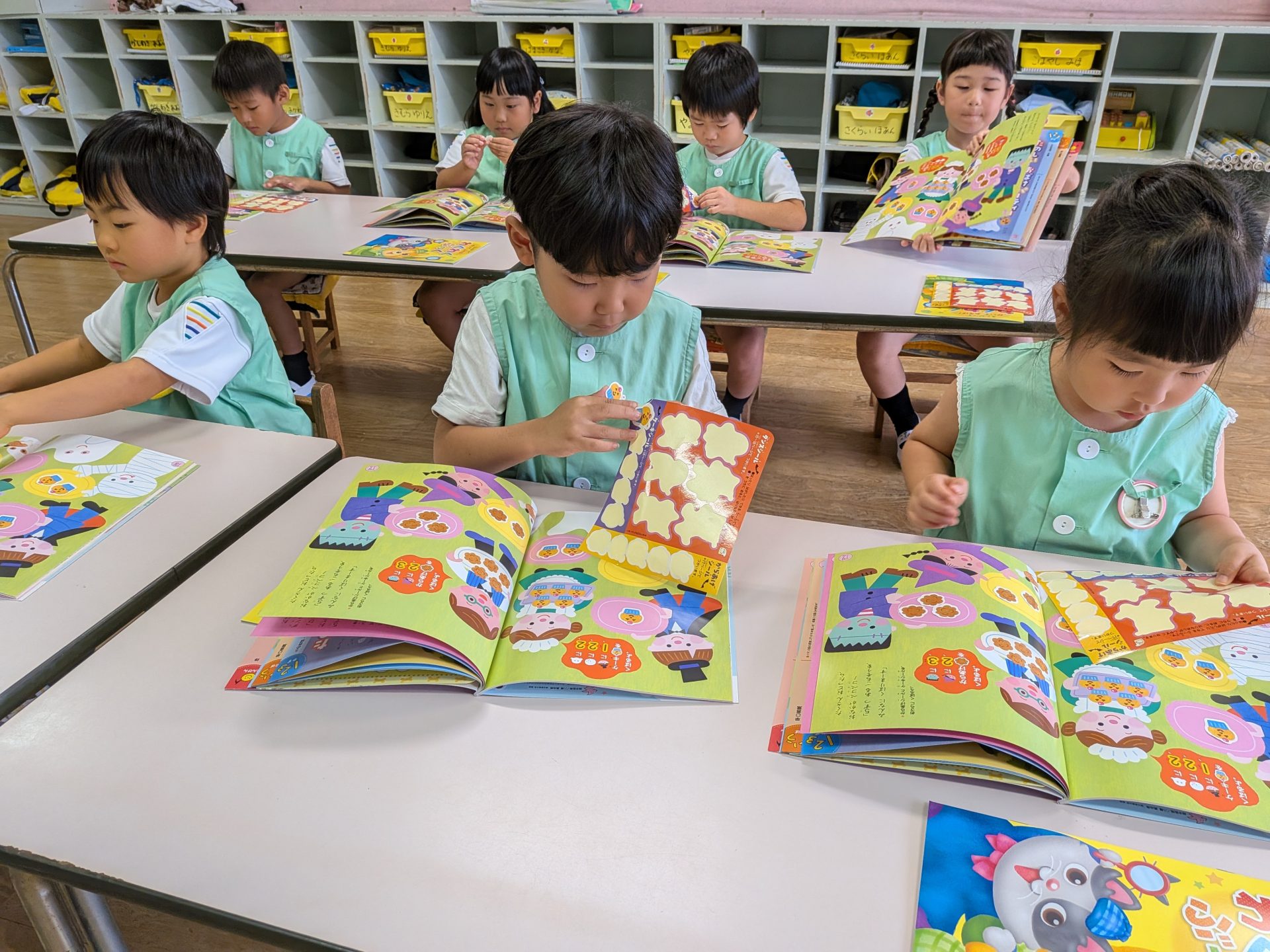 年長さんは絵本観察、指示された通りにお皿にシールを貼ったりとみんな真剣に取り組んでいました