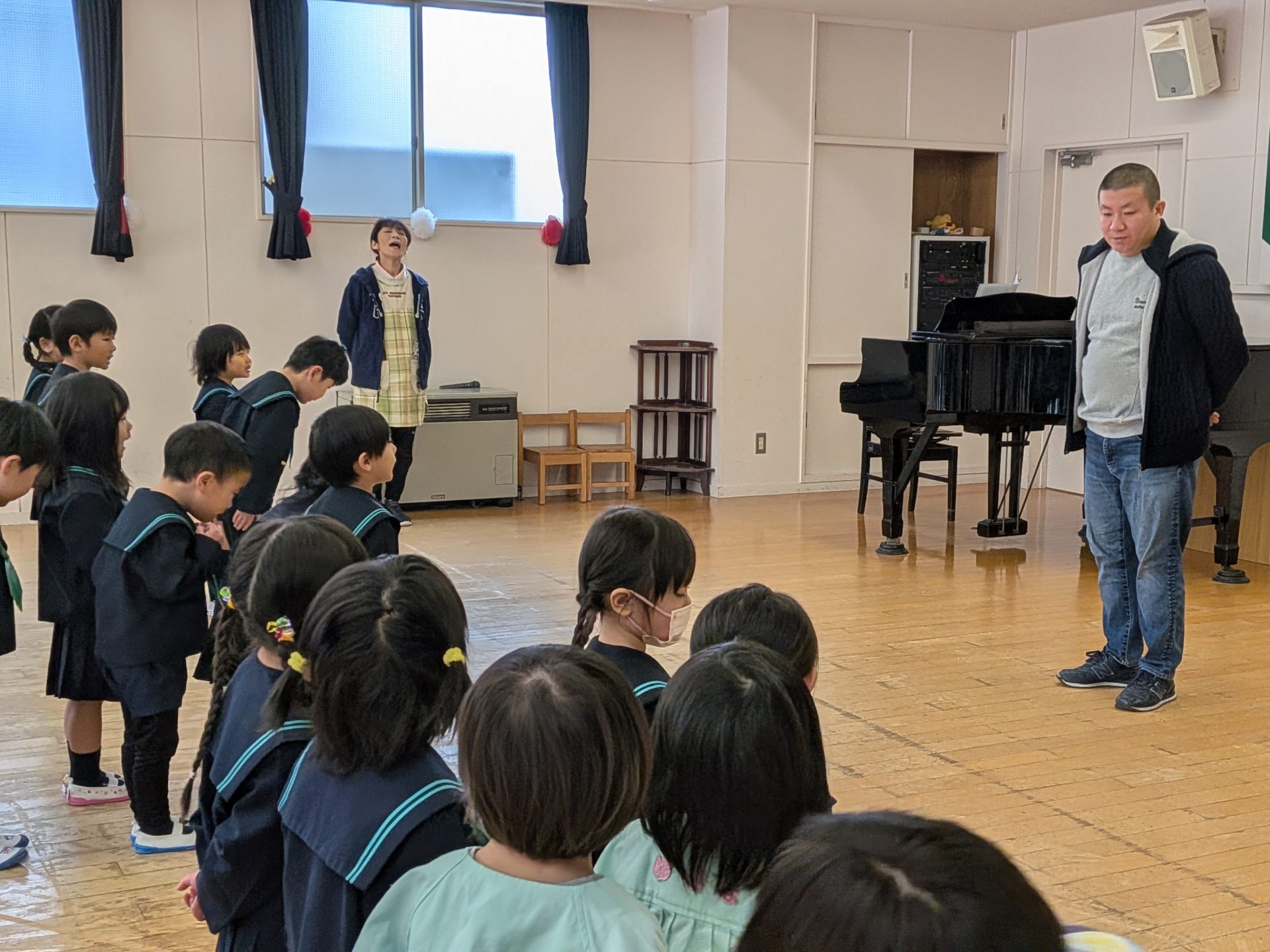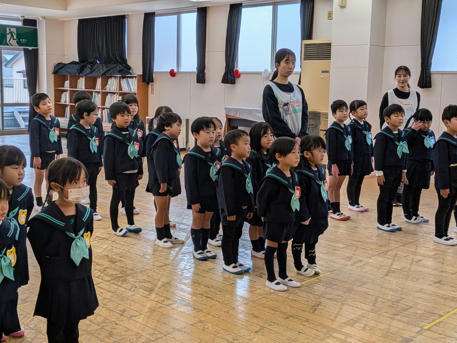 始業式の後には最近の地震のうけ、園でも避難訓練を行いました