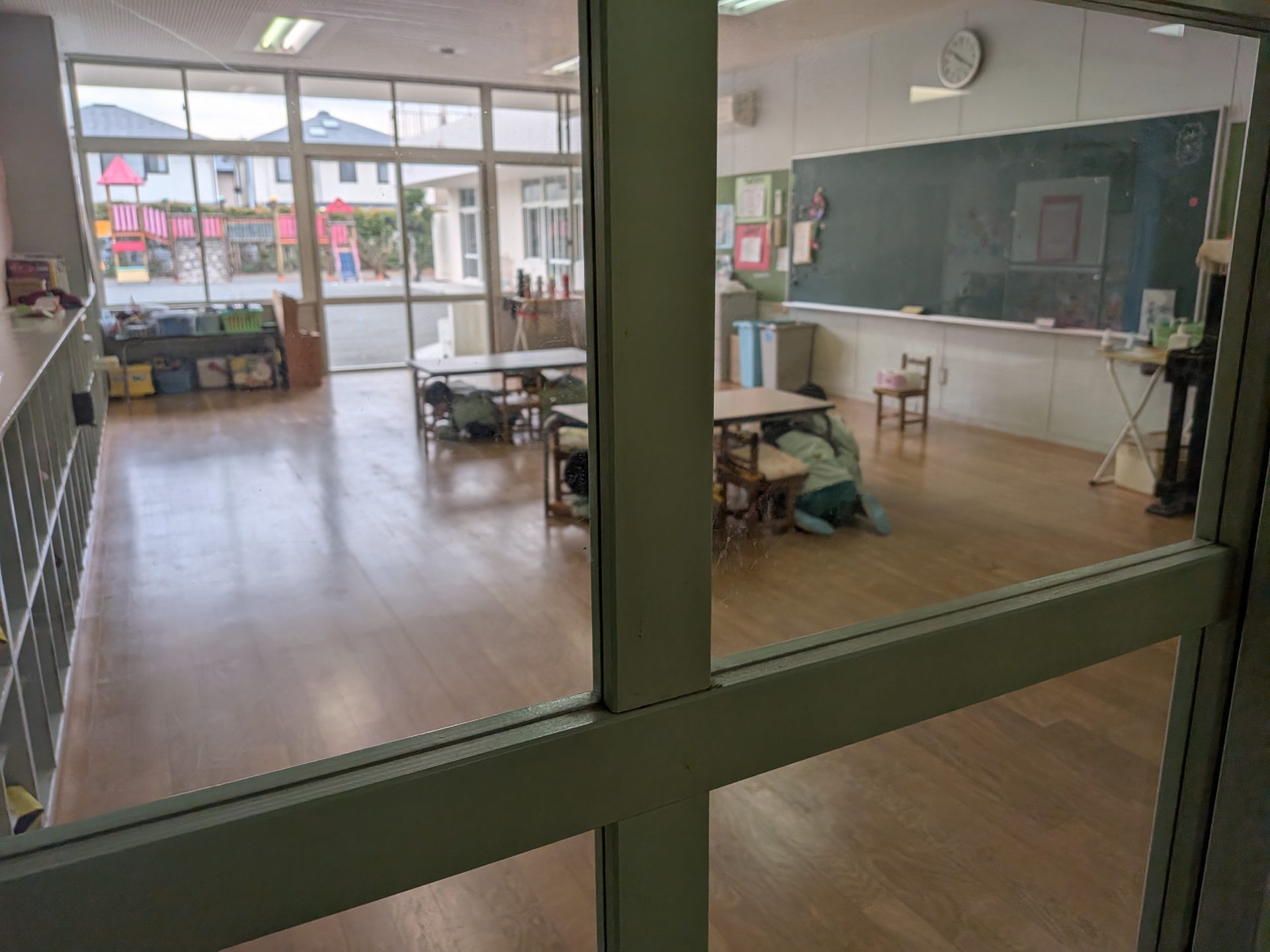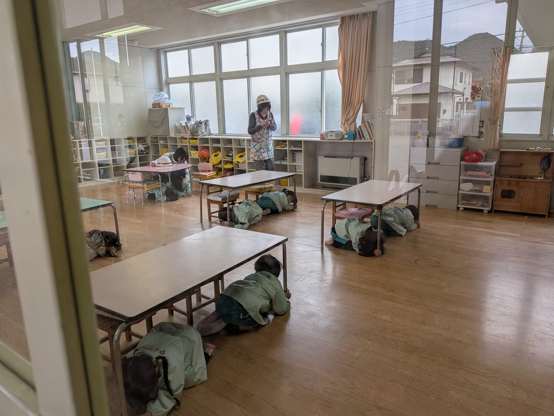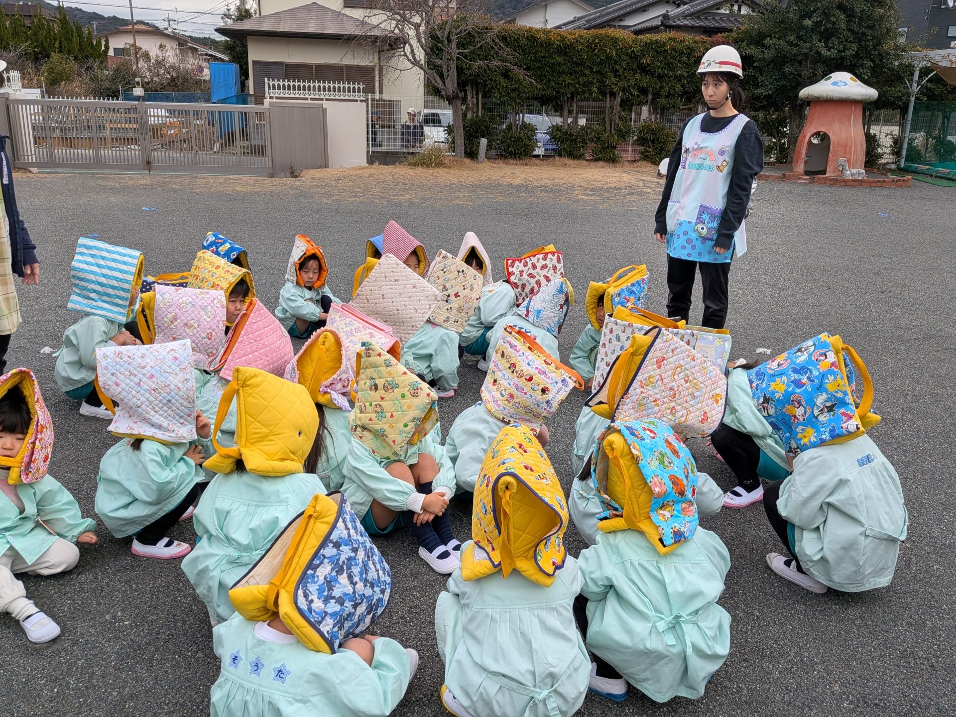 急な避難訓練でしたが、みんなしっかりと机の下にもぐり、放送の内容を聞き園庭へ避難することができました