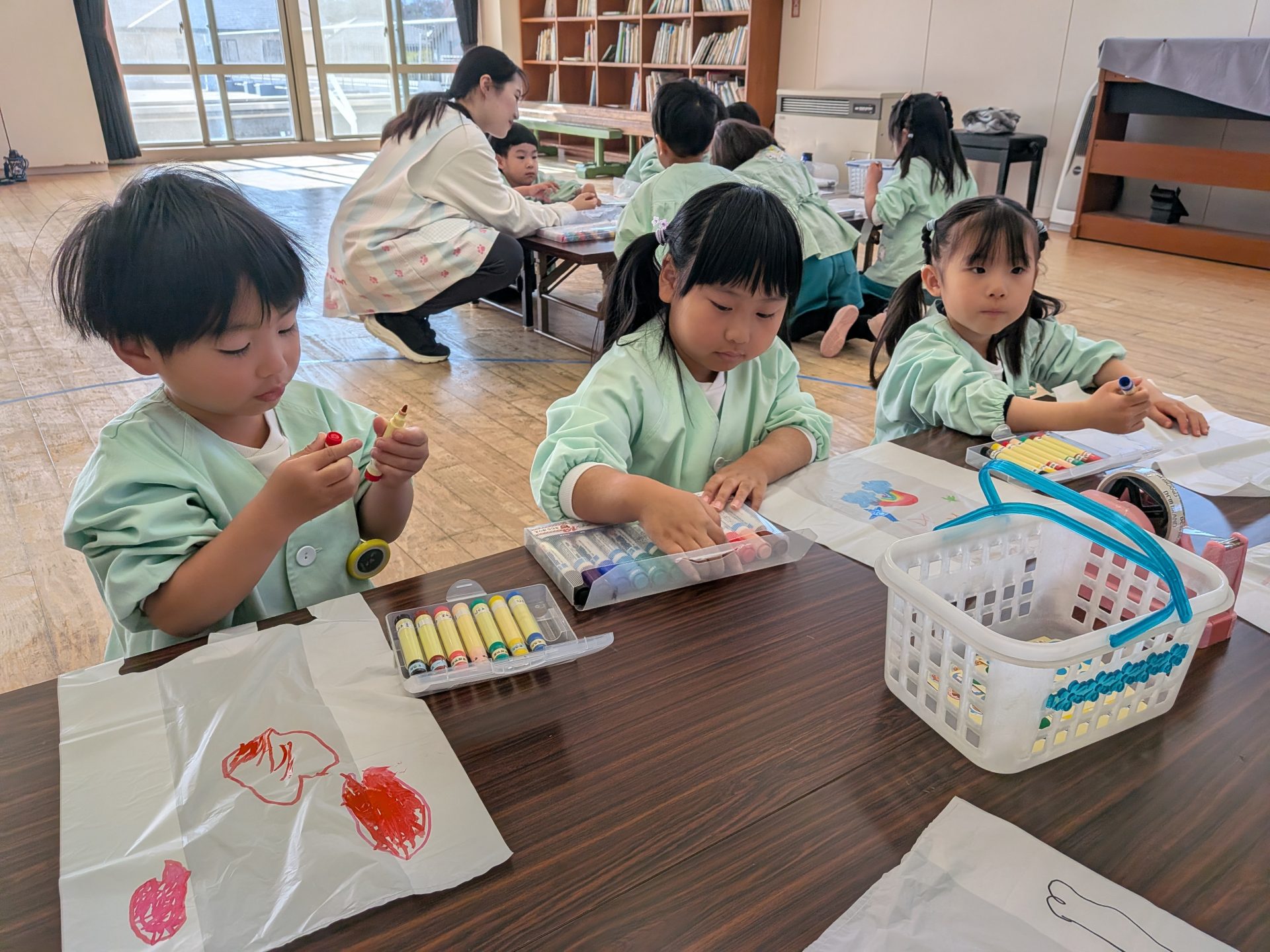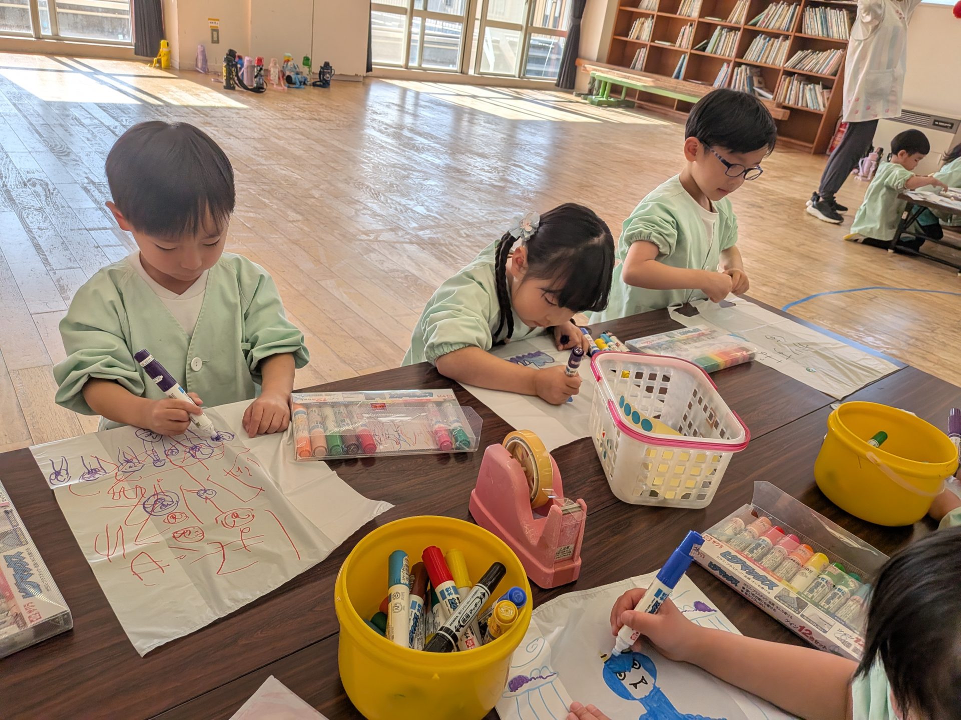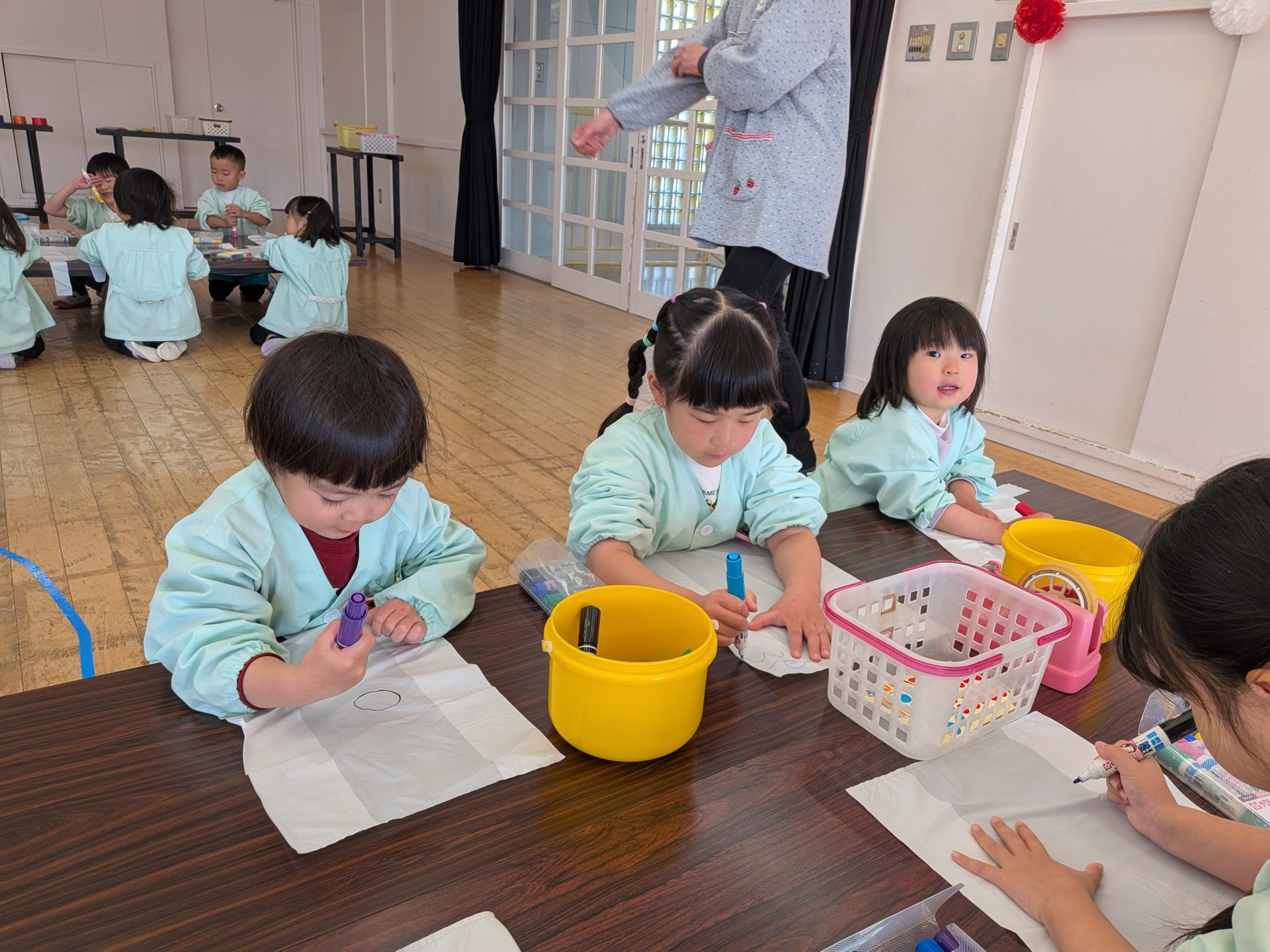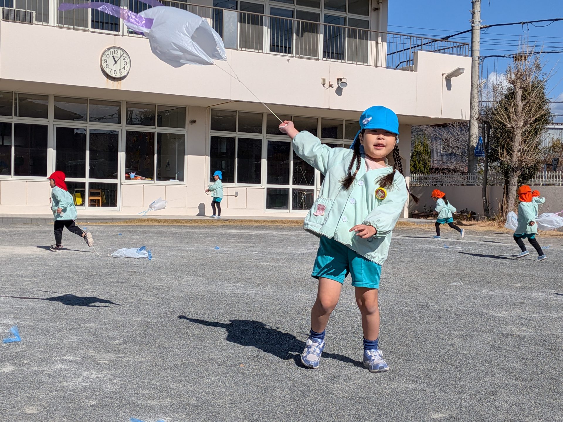 遊戯室で学年混合で凧作りをした後は園庭で凧あげを楽しみました